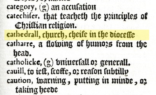 “Church” did not have its own separate listing either in 1604, but it is given as a synonym of “cathedral” which is “chief in the diocese”. In order to teach his readers how to find words, readers had to be taught the new concept of alphebetizing words.