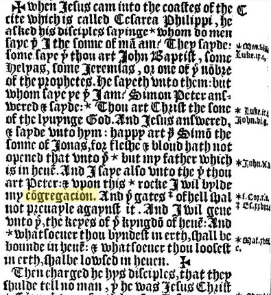 Before the word “congregation” evolved into today’s “the people who go to Church every Sunday to listen to a sermon”, it had blossomed from Tyndale’s word for what Jesus would build into the definition of a kind of church government not seen for centuries: in which congregations elected their own leaders. Today,