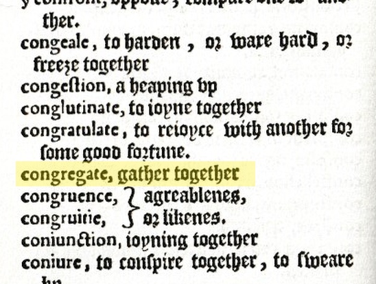 In the 1604 dictionary, “congregation” wasn’t even listed; the closest word was “congregate”, which meant “gather together”. No religious association is recorded.